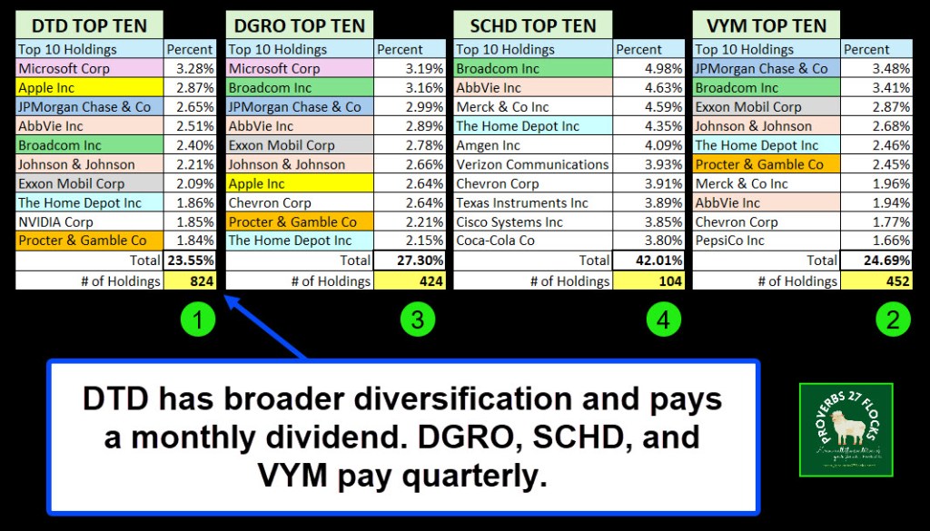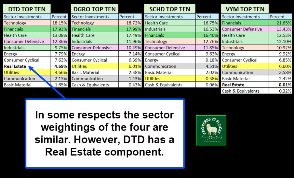 There are three reasons I am adding this to my normal mix of VYM, DGRO, and SCHD. First of all, DTD holds 824 companies that pay dividends. VYM is next with 452, DGRO has 424, and SCHD has 104. Because the focus is on dividends, there is an overlap in the top ten. The following two images show the sector mixes and the top ten holdings in all four ETFs.