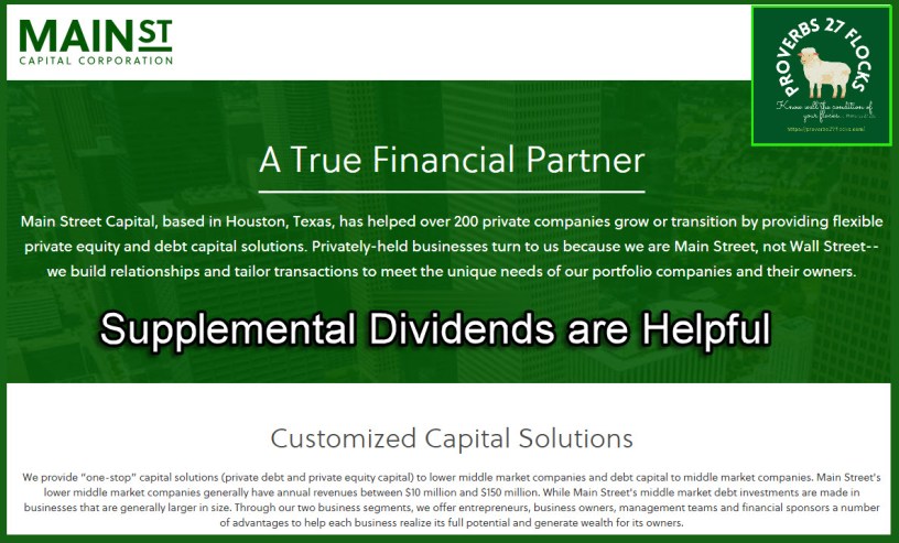 In addition to the normal monthly dividend of $0.24 per share, MAIN is paying a supplemental dividend of $0.30 per share in March. MAIN does not have a strong history of paying supplemental dividends, so investors should welcome them when they arrive but not expect them as a normal thing. If you do the math, you will see that we will receive $1.02 per share in MAIN dividends during the quarter. The normal quarterly dividend is $0.24 times three ($0.72/share), as MAIN pays a monthly dividend.