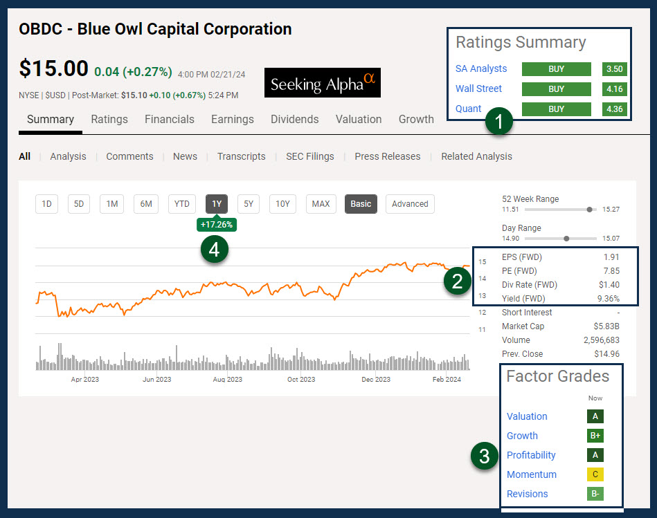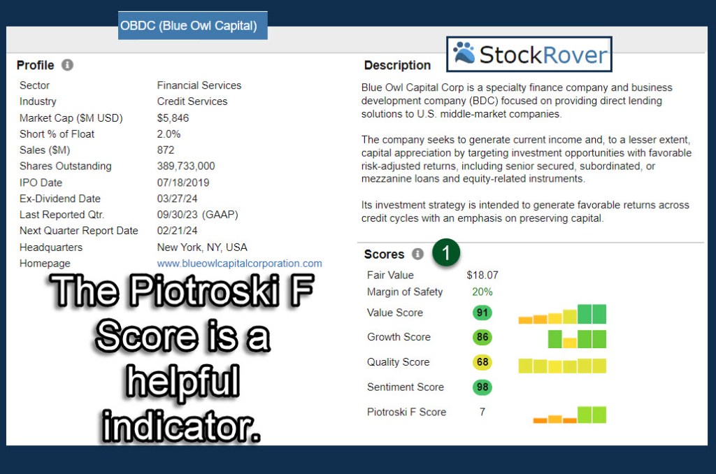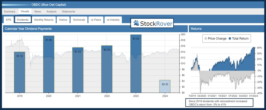 The Stock Rover dividend graph might cause some investors concern. 2021-2022 show lower dividends. However, special dividends do play a part in this. OBDC paid four special dividends in 2023, and each time the dividend increased. It was $0.04, $.06, $0.07, and $0.08 for those four supplemental “special” dividends.