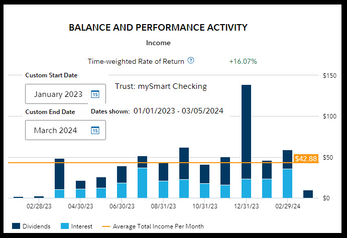 Finally, Fidelity also gives us a graph of the monthly (or quarterly, or annual) income in all of our accounts including the checking account. Interest and dividends shot up starting in March 2023, as that is when I got serious and moved funds from WB&T to Fidelity.