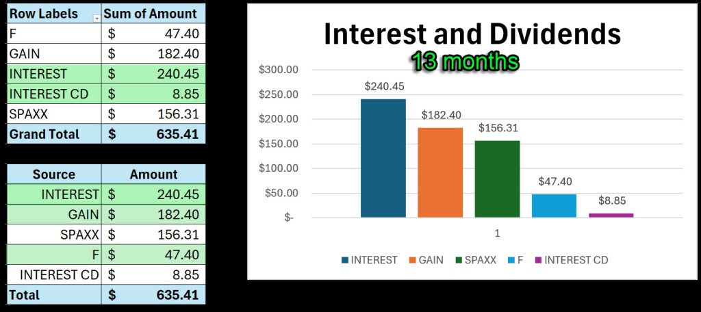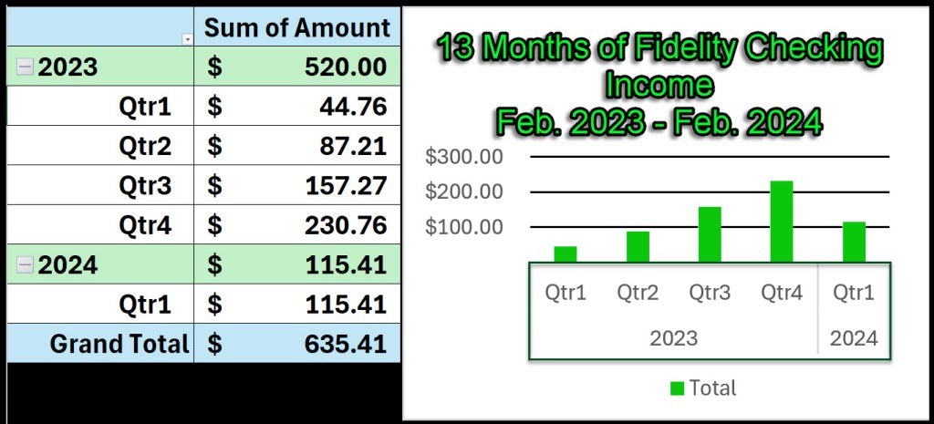 From February 2023 through February 2024 we have earned $635.41 in interest and dividends with the new approach. The first of the following images shows the quarter-to-quarter growth of income using Fidelity’s checking account. The second image shows the source of the various types of income. They include interest on the core account, dividends from the money market holding (SPAXX), interest from a short-term CD, and dividends from two stock holdings; F and GAIN. The interest from the core account, which is usually the largest dollar amount, is leading the others.