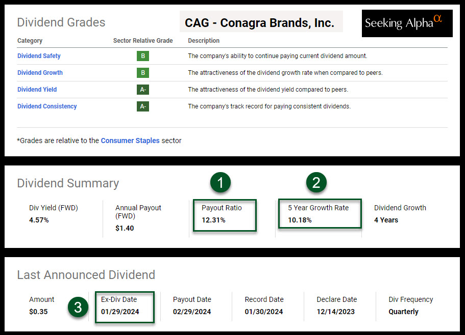 Conagra (CAG) is another dividend growth story. The dividend Payout Ratio is a good 51.49% and the dividend yield is a rational 4.48%. I also like the 5 Year Growth Rate of 10.18%. Furthermore, CAG is in the Consumer Staples sector, which is a good place to have some dollars for diversification. It might not be as fun as Apple, Tesla, and Microsoft, but it is less volatile as well.