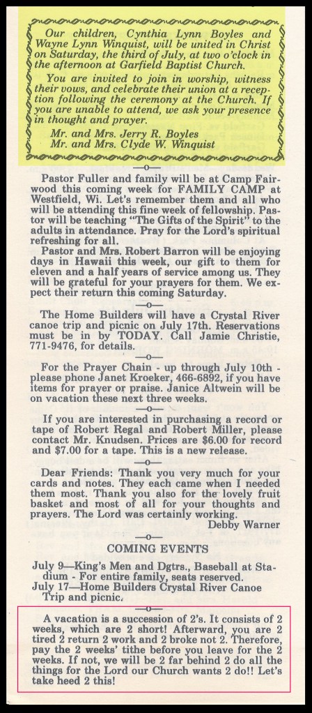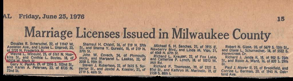 Rather than write extensively about this journey, I think it is best to share some pictures. There is the announcement in the Milwaukee Journal about our marriage license and a note in the Garfield Baptist Church Sunday bulletin about our upcoming marriage.