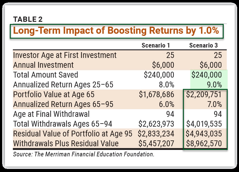 Table 1 is also most interesting. Let’s imagine that your total costs of investment are only 0.50%. Even then your total “Withdrawals plus Residual Value” by being cost conscious is significantly better by keeping your costs low.