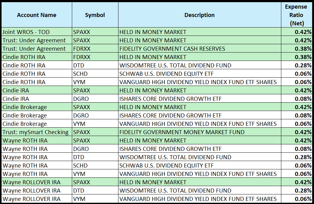 In this month’s AAII Journal there is a very thought-provoking article by Paul Merriman. The article’s title is “Winning the Battle Against Investment Fees and Biases.” Let’s just talk about fees. Most of my friends know that I strive to keep our non-money market holdings to an expense ratio of less than 0.10%. Here is a list of all of the mutual funds and ETFs we own at Fidelity. With the exception of DTD, all of the other non-money market funds have an expense ratio of 0.06% or 0.08%.