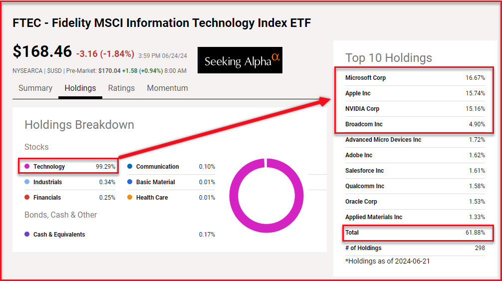 However, I am now very concerned about this ETF. One of the reasons is the reality of the top four investments. Those four are MSFT, AAPL, NVDA, and AVGO. Don’t get me wrong. These are all great businesses that an idiot could run (I hope). But to have an ETF where over fifty percent of the dollars are invested in four companies doesn’t strike me as prudent in diversification.