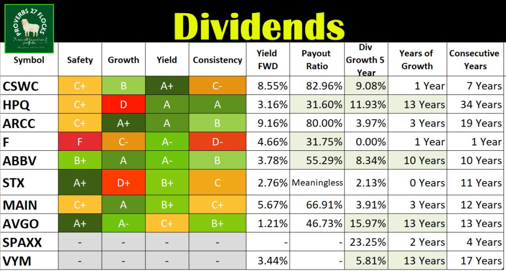 Don’t buy these ten just because I like them. Also bear in mind that the overall size of your entire investment portfolio matters, and smaller portfolios should stick to ETFs like SCHD, DGRO, and VYM. Finally, never make any single stock more than five percent of your total dollar investment. So, for example, you should not make ABBV 8% of your portfolio. Even though it is a good company, you don’t want to have a lopsided investment mix.