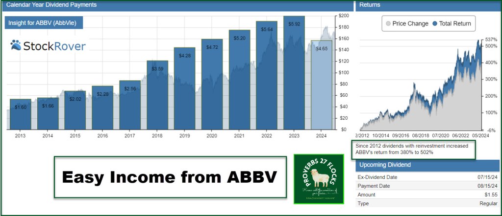 I also hold 700 shares of ABBV in my ROTH IRA, and the reason is simple. The dividend yield is 3.69% and the five-year dividend growth rate is 8.34%. ABBV has been paying growing dividends for ten years. The next Ex-Dividend Date is Monday, 07/15/2024. Therefore, the $ 1.55 per share dividend will translate into $1,395 of cash for the 900 shares on August 15.