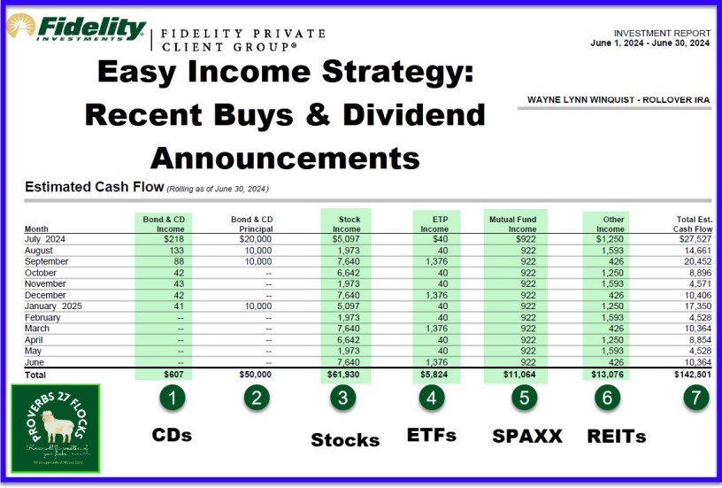 I continue to buy short-term CDs that have brought our total CD holdings to $103K. I expect the Federal Reserve to start lowering interest rates before the end of the year. None of the CDs I purchased yields less than 5%, so the annualized income for these is quite attractive. Most of them pay monthly interest.