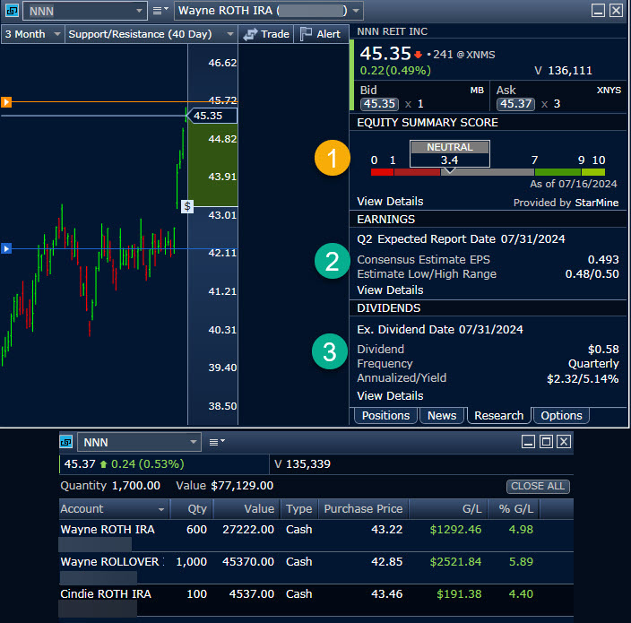 I purchased another 300 shares of NNN. This brings our total share count to 1,700 with a current value of about $775K. The Ex-Dividend date for NNN is July 31, and the dividend per share will be $0.58. Therefore, we will receive $986 if I don’t sell shares before the ex-dividend date.