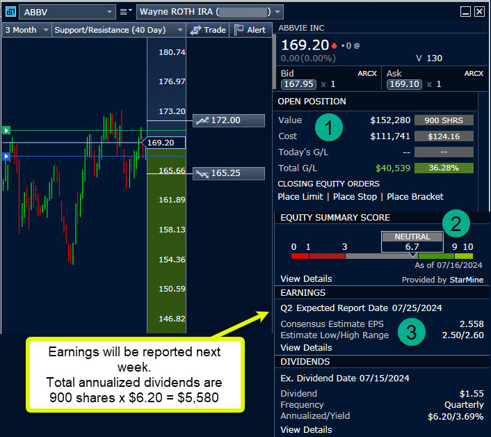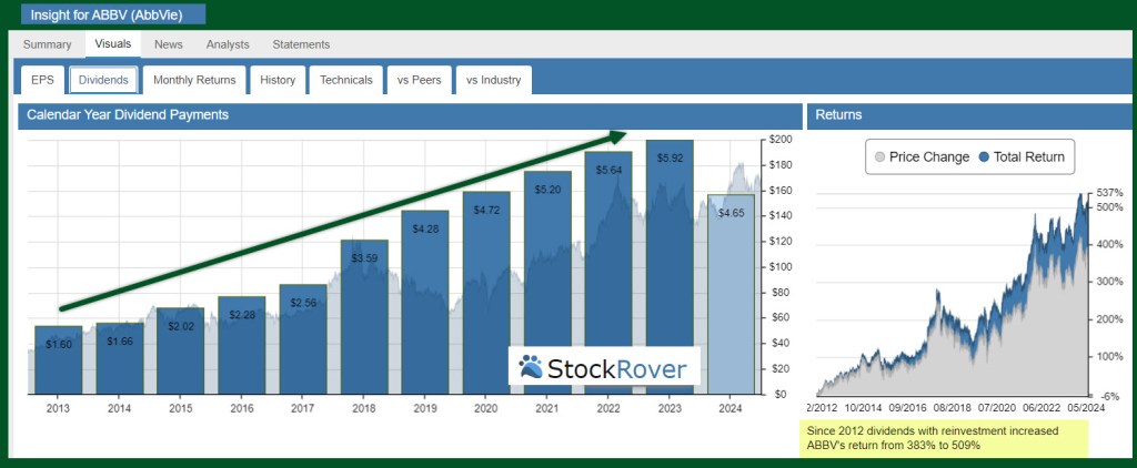 In my previous post I mentioned that I purchased another 50 shares of AbbVie Inc. (ABBV) in my traditional IRA. After reviewing the likelihood of continued growth in the stock price, I decided to convert all 200 shares of ABBV from my traditional IRA to my ROTH. As a result, there are 900 shares of ABBV in my ROTH account. They are currently worth just over $152,000 and yield 3.69%. The annualized dividend per share is $6.20, so the easy income from this investment is $5,580. In other words, we can withdraw these dividends without paying income taxes. In addition, all capital gains, if any, will be tax free. Furthermore, I can trade covered call options on these shares, and not pay income taxes on those gains as well.