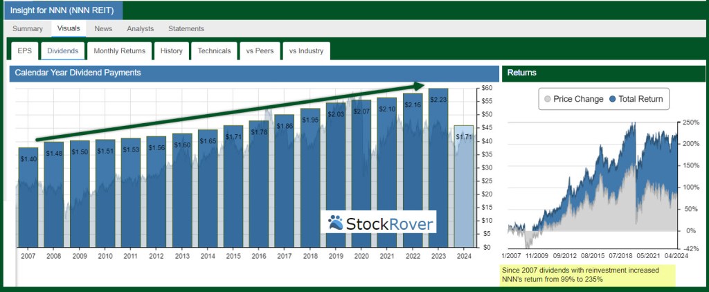 NNN REIT invests primarily in high-quality retail properties subject generally to long-term, net leases. As of December 31, 2023, the company owned 3,532 properties in 49 states with a gross leasable area of approximately 36.0 million square feet and a weighted average remaining lease term of 10.1 years. NNN is one of only three publicly traded REITs to have increased annual dividends for 34 or more consecutive years.