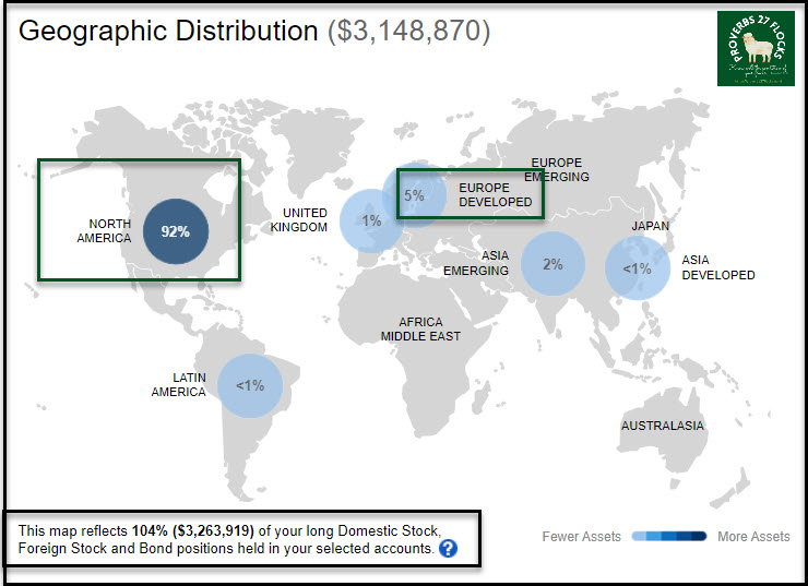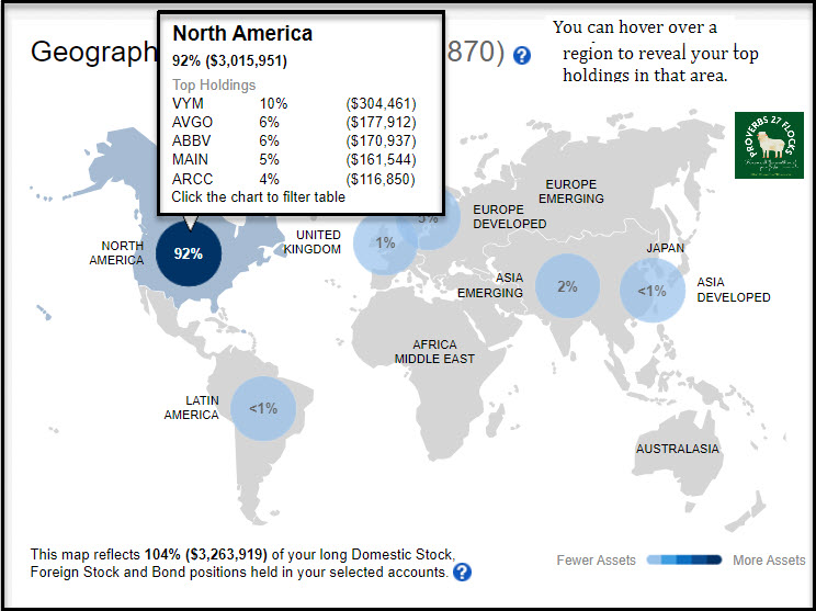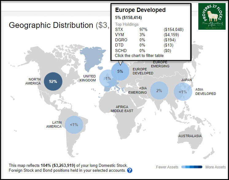 Most of our investments in are North America, followed by Europe Developed. The areas where we have small investments are primarily the result of owning ETFs that buy some foreign investments. VYM is the largest player in our portfolio for some international exposure.