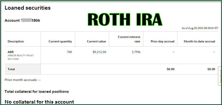 Given the fact that ABR shares were loaned Tuesday, I expect to see a trade confirmation for the 700 shares in the ROTH and the 500 shares in the IRA this morning.