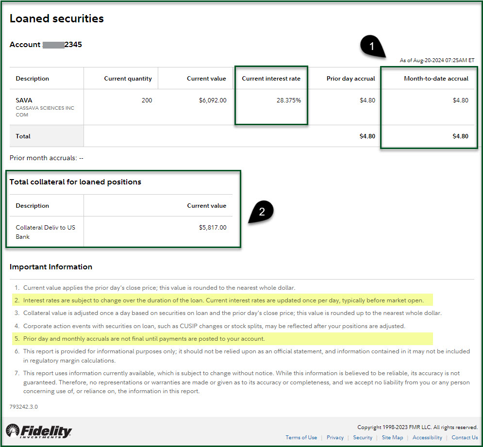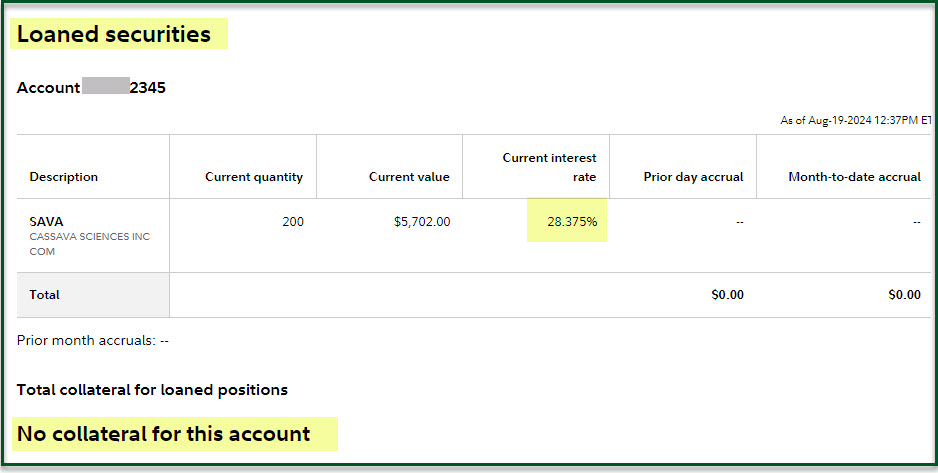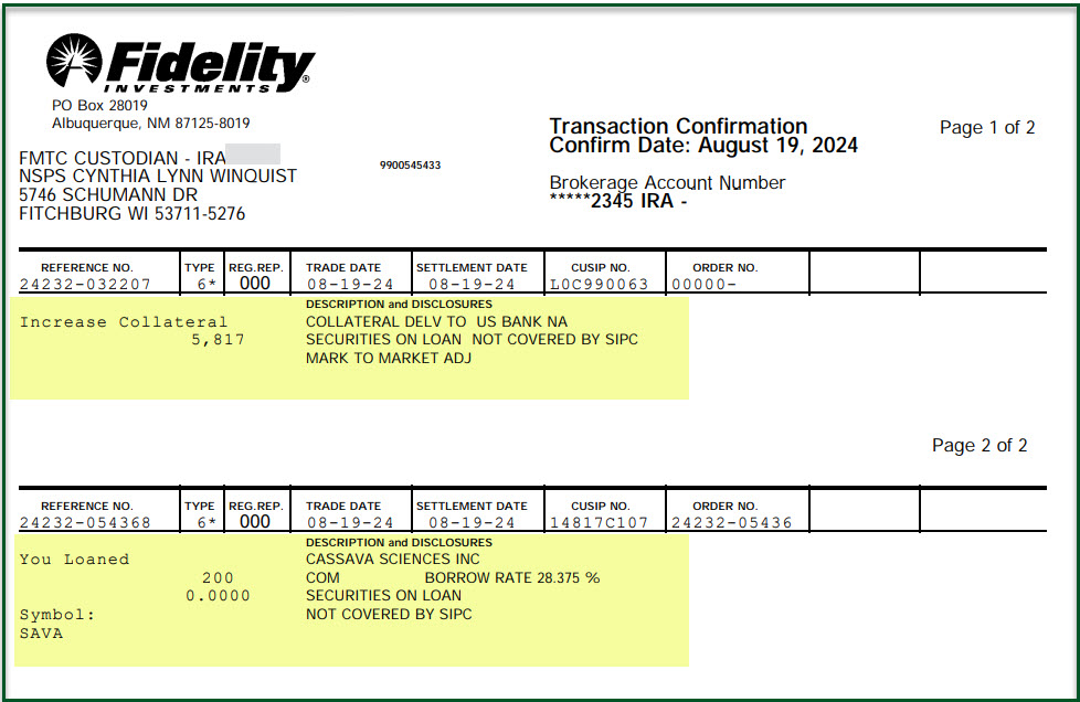 As promised, Fidelity did provide a trade confirmation for the SAVA shares. It was a two-page confirmation. The first page showed that collateral was created at a bank to cover the value of the SAVA shares in the event that Fidelity was to fail for some reason. The second page shows the loan of the 200 shares along with the borrow rate of 28.375%.