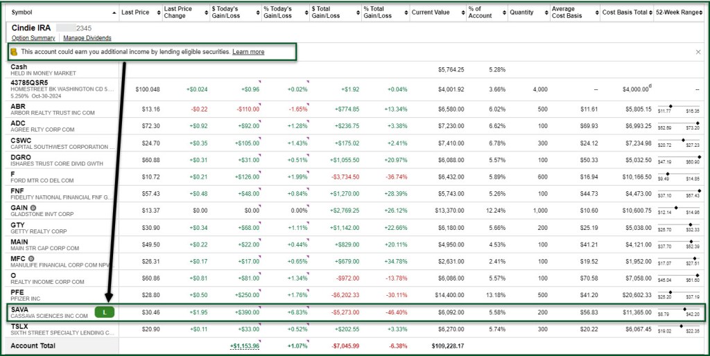 In addition to SAVA, her REIT investment ABR (Arbor Realty Trust, Inc.) is also activated for both her ROTH IRA and her traditional IRA. The interest rate isn’t quite as exciting at 3.75%, but when you add dividends from ABR, it is a nice addition. She has 700 shares of ABR in her ROTH and 500 shares in her traditional IRA.