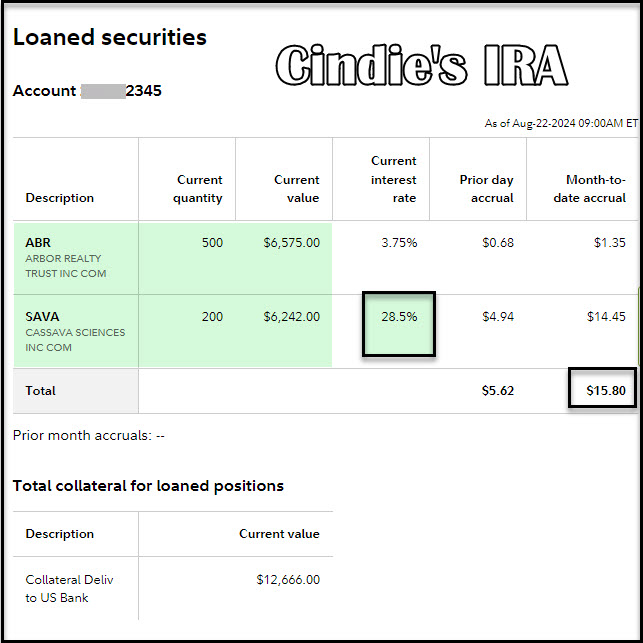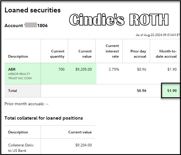 One other thing I have noticed is daily activity adjusting the collateral on the shares lent. On August 21 the collateral was adjusted down by $453 for Cindie’s lent shares. On August 22, 2024 the collateral was adjusted up by $594. This doesn’t have any impact on the model, but it is encouraging to see that the investment is protected.
