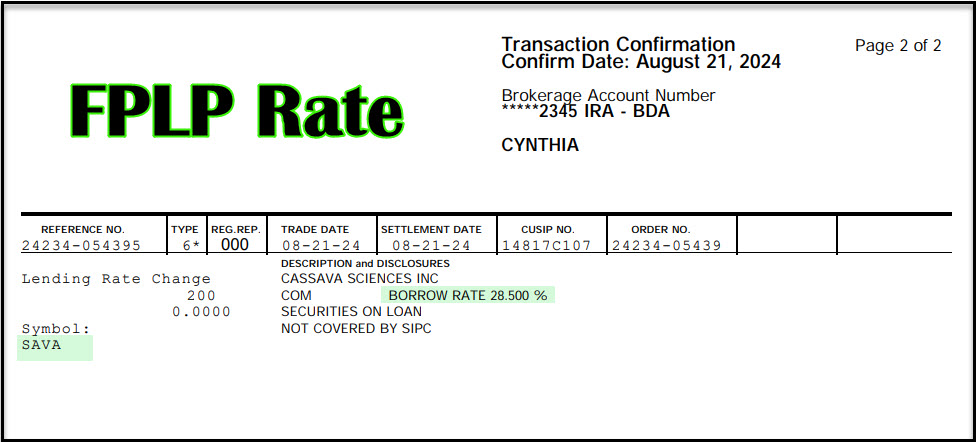 Another thing I noticed was a trade confirmation for SAVA that showed the interest rate on the loaned shares has increased from 28.375% to 28.50%. This is not a huge increase, but every move up is more income.