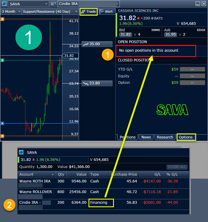 Therefore, the top image in this screen shot is the window that shows Cindie’s SAVA holdings in her IRA account. The bottom image is a separate ATP window that shows we hold shares of SAVA in three accounts.