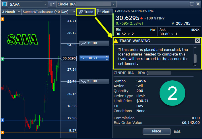 I attempted to enter an order to sell Cindie’s SAVA shares that are on loan. That feature works. In fact, it also alerts me that the loaned shares will be returned to the IRA account so that the sell trade can be settled.
