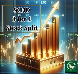 Cindie and I own 960 shares of SCHD, so when the split happens we will own 2,880 shares of SCHD. This doesn’t increase or decrease the value of the holdings, but it does change some market dynamics. For example, if I want to trade covered call options on my SCHD shares in my ROTH IRA, because I own 700 shares, I can trade seven contracts (100 shares per contract) on my shares. After the split, I will own 2,100 shares, which gives me the ability to trade 21 covered call contracts.