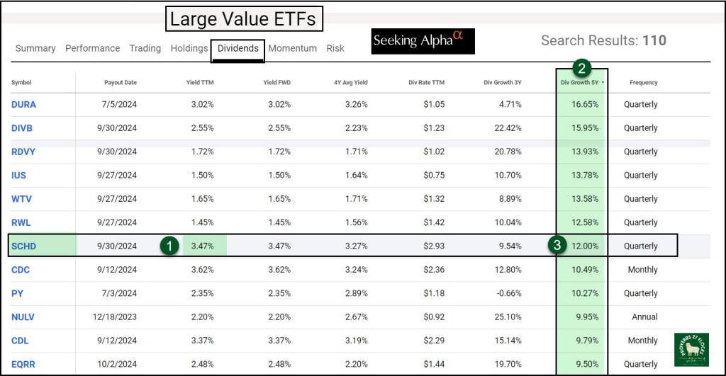 Although SCHD is not currently a buy according to the QUANT rating, there are two attributes I find very attractive. First of all, of the 110 Large Value ETFs, SCHD falls within the top ten for the 5-year dividend growth rate. Furthermore, it offers a good yield of 3.47%. This doesn’t change when there is a stock split. The reason is simple: you still get the same dollar amount, even if the dividend per share is smaller. For example, the most recent quarterly dividend was $0.75, so for 100 shares you would receive a dividend of $75. After the split, the same dividend would be $0.25 per share, but you have 300 shares, so you still get $75.