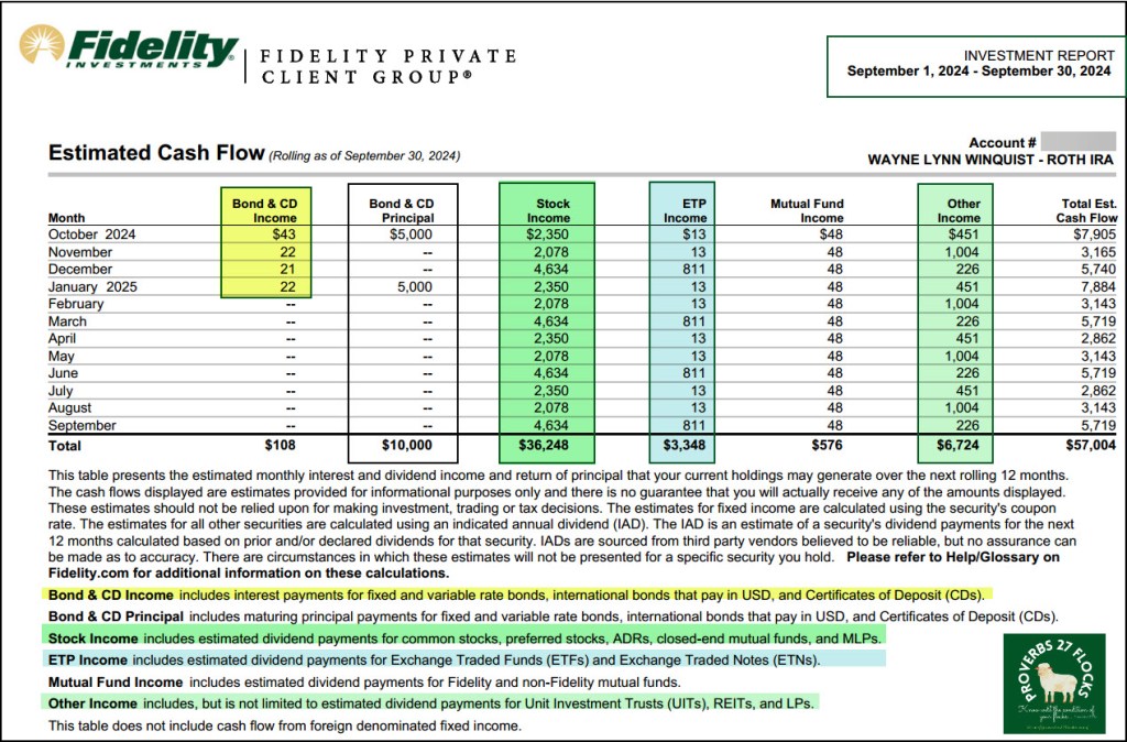 While it is certainly nice to see the increase in the value of our investments, you cannot live off of or give from a statement balance. Income is the only real money. If you don’t invest in stocks and ETFs that pay a dividend, then you probably have to sell some of your investments to generate cash. Therefore, of the 102 pages of my September statement, the following one is of most interest to me. It is a focus on the Estimated Cash Flow.