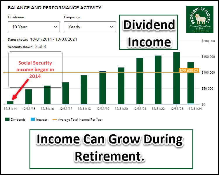 An Easy Income Dividend Growth approach should result in growing income. If it doesn’t, just remember inflation will grow. I started taking Social Security in 2014. That “income” has grown, but not very well. The government is not going to give me the same income growth that I can get from our investment portfolio. By implementing a dividend growth approach we have had more than sufficient income from our investments.