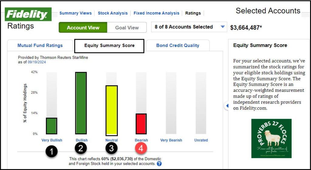 Do you have a high-level view of the nature of your investments? While I am not a huge fan of the Fidelity Investments Equity Summary Score, it does help illustrate the relative risk weightings of our investments. I want the majority of our investments to be “very bullish” and “bullish.” I don’t want to be in the “very bearish” portion of the overall market.