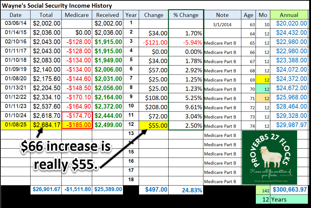 Assuming you fall in the right income bracket your premium is increasing by about $10 in 2025. That means your real income increase per month in 2025 will be $40 per month. That means you will receive less than ten dollars more per week. Remember that when you go to buy groceries or fill up your SUV’s fuel tank.