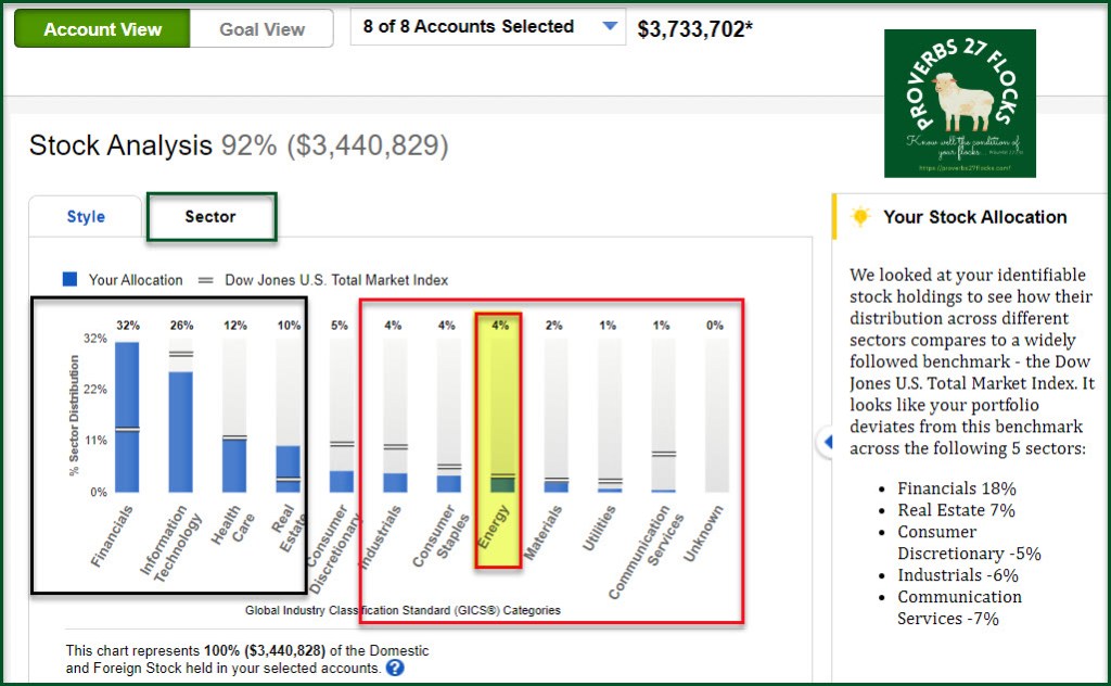First, let me say that my exposure to the energy sector is like the total market index allocation of energy: about four percent. This is due primarily to the holdings in the ETFs we own: DGRO, SCHD, and VYM. Chevron and Exxon Mobil appear in DGRO and VYM’s top ten. I also own shares of EOG (EOG Resources, Inc.) which is in the Oil and Gas Exploration and Production industry subsector.