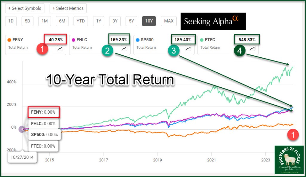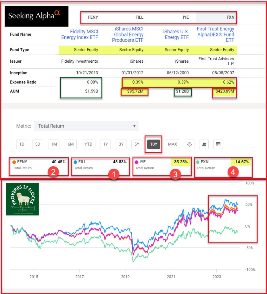 The problem with most energy stocks is that they don’t really have good long-term returns. If you compare some popular energy ETFs (FENY, FILL, IYE, and FXN), you will quickly see that the ten year total returns are just awful. In reality only FENY and IYE are worthy of any consideration due to assets managed.