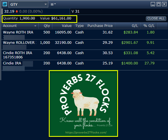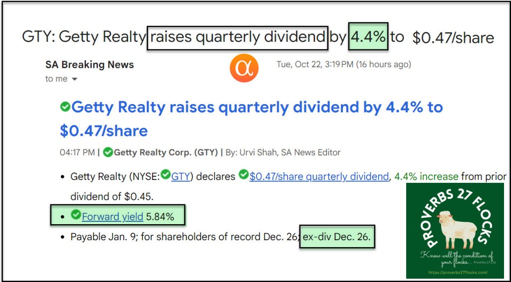 GTY just announced an increase of 4.4% for their quarterly dividend. They raised the dividend from $0.45 per share to $0.47 per share. Because Cindie and I own a combined total of 1,900 shares, the extra two cents per share is the same as an additional $38 of income. That is $152 more annualized.