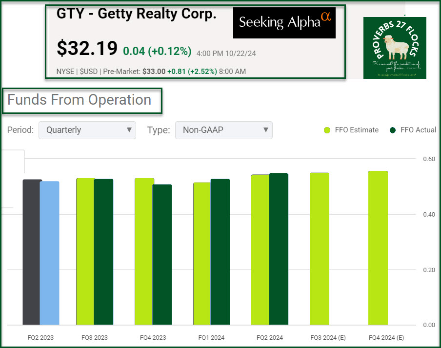 Also, don’t forget to look at the revenue trends for each individual stock. Finally, if you invest in a REIT, pay attention to the FFO (Funds from Operations.) The FFO is a good indicator of whether the dividend makes sense. The FFO annualized should be larger than the dividends paid annually. Here are two graphs for GTY. Both tell a positive story. Note that the quarterly FFO is greater than the new $0.47 dividend.