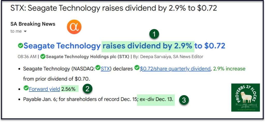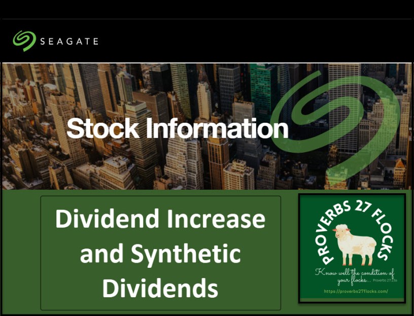Some positions don’t pay any dividends, but I get “synthetic” dividends. Some stocks do pay a quarterly dividend, but I also can receive, with a bit more work, synthetic dividends. This is true of our investment in Seagate Technology Holdings.