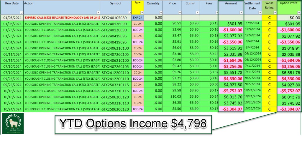 In the following illustration I use some abbreviations for the types of options contracts I write. EXP-24 indicates an options contract that expired in 2024. I was writing options on my STX shares in 2023 for synthetic dividend income.
