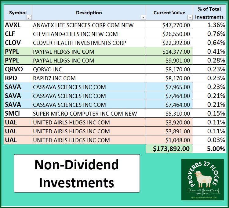 In addition to dividend-paying investments, we also hold investments that do not pay a dividend. These include AVXL, CLF, PYPL, QRVO, RPD, SAVA, SMCI, and UAL. Why these investments? Each of them has either the potential for significant capital gains (or losses!) and each of them can be used to gain covered call options income.