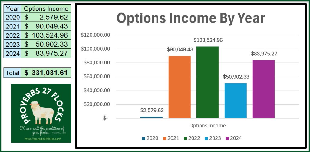 Our YTD options income now exceeds $80K. The first image shows my options income for the first four years I traded options (2020-2023). The 2024 story remains to be seen, but it is encouraging to see that I have improved upon my 2023 results. I am optimistic that I can beat my 2022 results, or at least get close to $100K in options income this year.