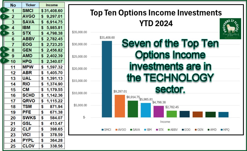 Of the top ten contributors to our option income, seven have a connection to technology. They are SMCI, AVGO, IBM, STX, GEN, AMD, and HPQ. I no longer have shares of AMD, but it was a good play earlier in 2024. Only three of my options trading stocks lost money trading options. They were GLYC, KO, and QCOM. The lesson here is that you should diversify your options trading or be less aggressive than I am when trading options. I have traded options on 47 different stocks and ETFs. ETFs are not as profitable from an option’s perspective, but you can be successful in learning how to trade options using an ETF like SCHD.