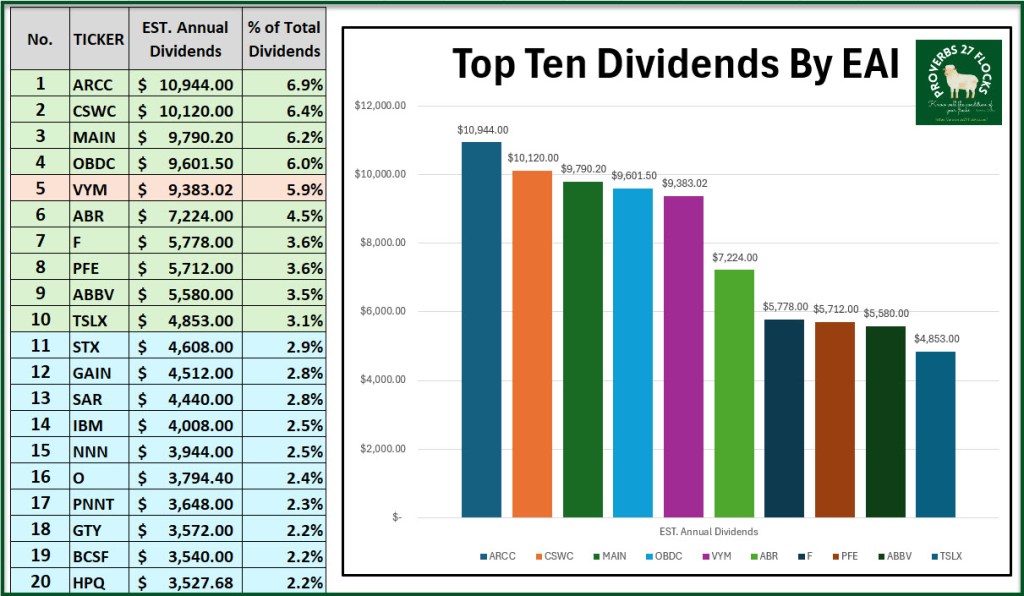The next image shows the top ten contributors to our estimated annual income. The top four are all BDCs: ARCC, CSWC, MAIN, and OBDC. VYM, an ETF, comes in fifth place and ABR, F, PFE, ABBV, and TSLX round out the top ten. I’m willing to assume the additional risk by investing in BDCs to drive extra income for charitable giving.