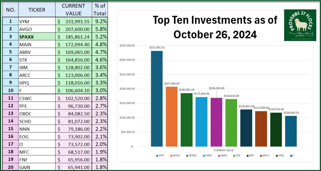 We have about sixty different investments. Because I manage eight accounts for my wife and myself, it is helpful to see them consolidated. VYM, AVGO, SPAXX, MAIN, and ABBV are the big five and STX, IBM, ARCC, HPQ, and F round out the top ten. Note that I have heavy allocations to technology and health care. Most of these investments also contribute significant options income using covered call trades.