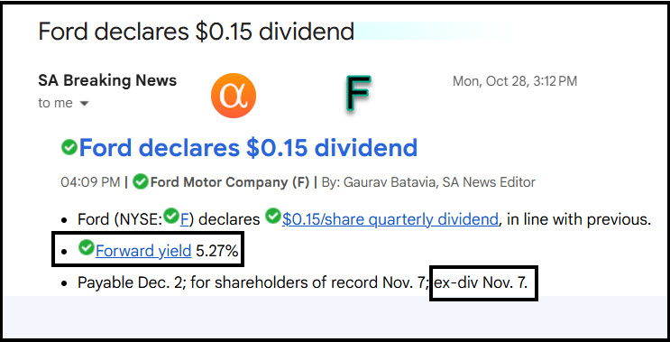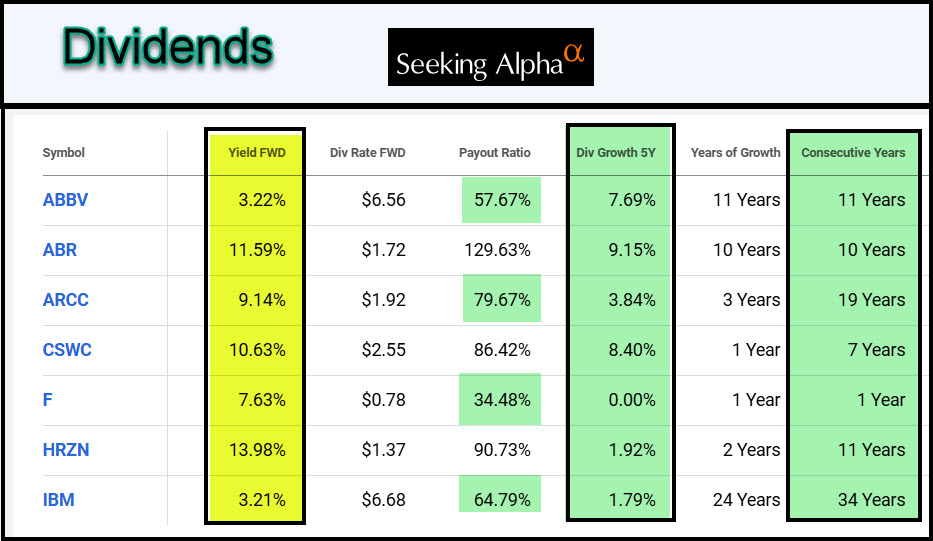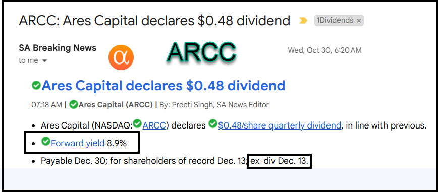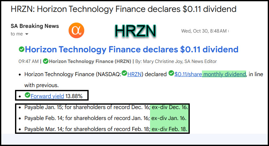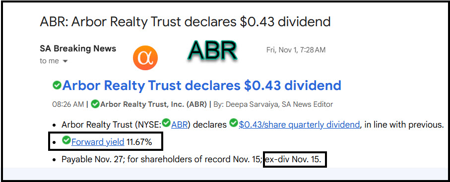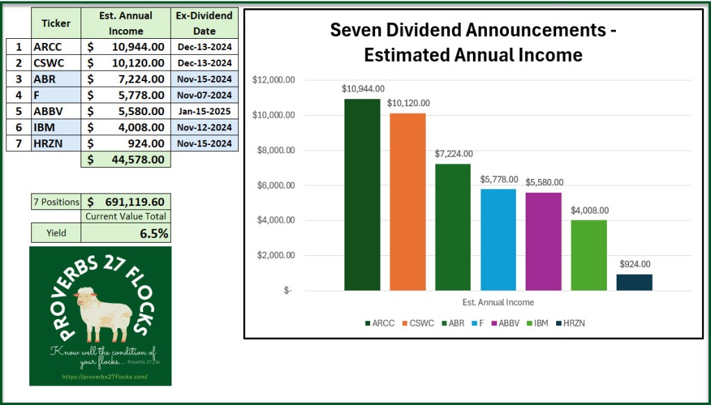From October 28 through November 1 I was reminded that our easy income continues to provide a helpful income stream. The companies that announced dividends included ABR, HRZN, IBM, ABBV, ARCC, CSWC, and F. ABR is a REIT, HRZN, ARCC, and CSWC are all BDC’s (Financial sector), IBM is in technology, ABBV is a healthcare Biotechnology powerhouse, and F is a Consumer Discretionary Automobile Manufacturer. The seven emails I received are shown below.