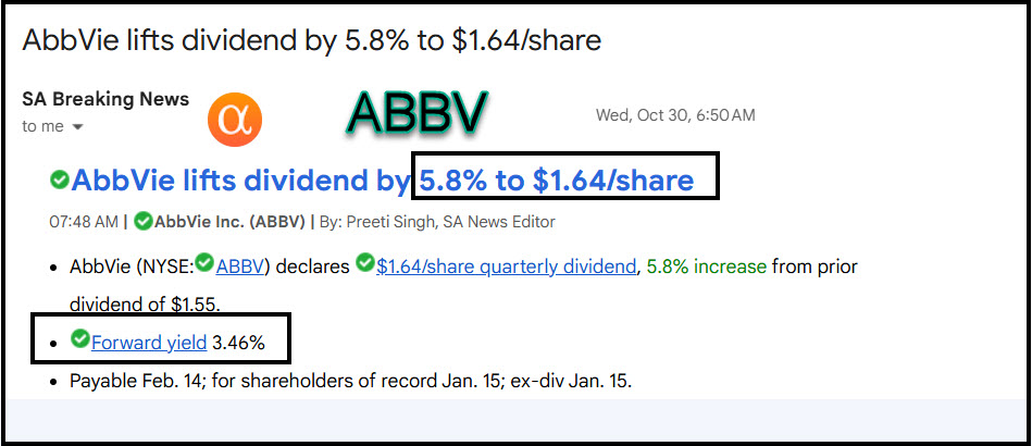 I hold 900 shares of ABBV in my ROTH IRA. Therefore, based on the current stock price, my shares are worth $183,195.00. To put this in perspective, ABBV is 5.4% of our total investment assets. That means it is in my top five investments. VYM is number one, and AVGO is number two.