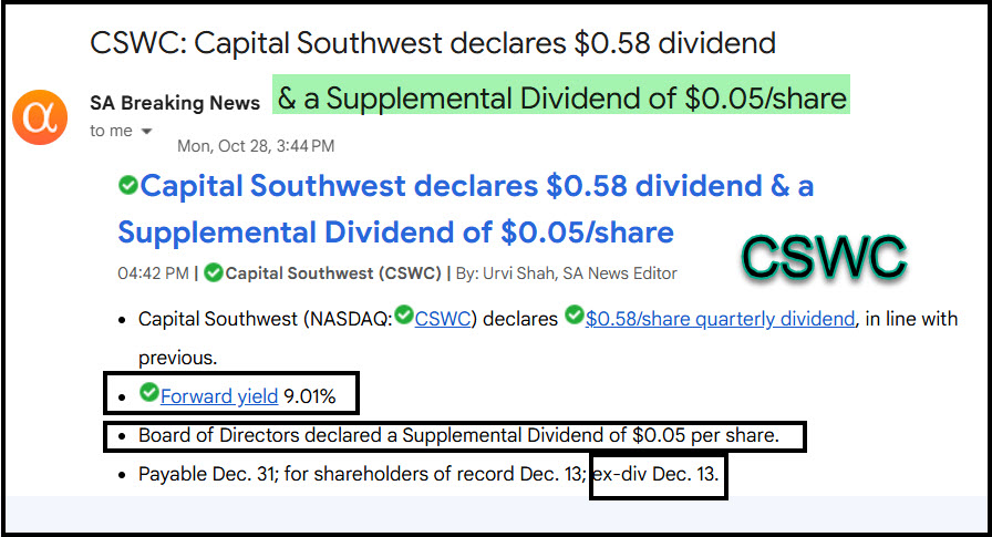 What stood out from these seven are CSWC, which announced the regular quarterly dividend of $0.58 per share and another special dividend of $0.05 per share. The previous five CSWC special dividends were $0.06 per share, so this was a slight drop. However, a special dividend is just extra income and should not be expected as normal. Another way to look at this is the next total dividend is $0.63 per share.