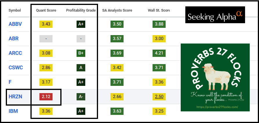 Before you rush out and buy shares of these seven, press the pause button. For example, HRZN has a current yield of 13.98%. That may not be sustainable. If you look at HRZN’s current Quant rating, you will see that it is 2.12. In Seeking Alpha land, that means I should sell my shares. However, HRZN has a good profitability score, so I will continue to hold my shares. Furthermore, HRZN provides monthly income of $0.11 per share and they have been paying this amount since December 2022.