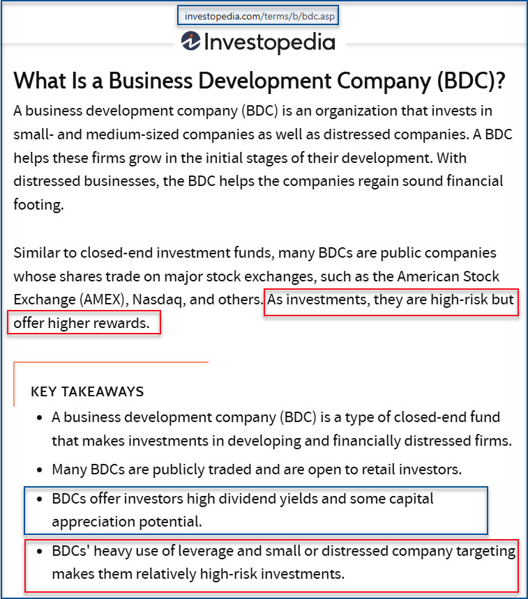 “A business development company (BDC) is an organization that invests in small- and medium-sized companies as well as distressed companies. A BDC helps these firms grow in the initial stages of their development. With distressed businesses, the BDC helps the companies regain sound financial footing.” – Investopedia
