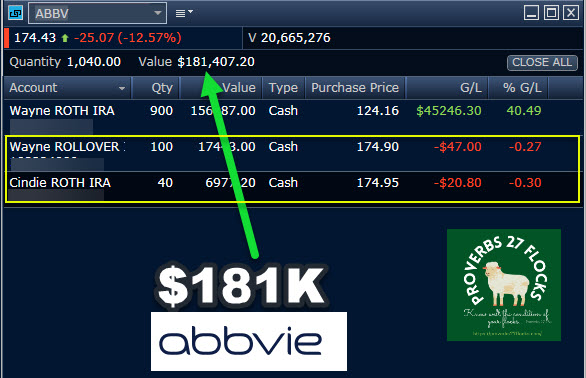 I already own 900 shares of ABBV in my ROTH IRA, so I did a covered call option trade for nine contracts on those shares. That earned me about $190. The contract expires on Friday at a price of $185, so it is very unlikely that my ABBV shares will be called away.