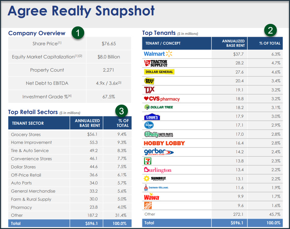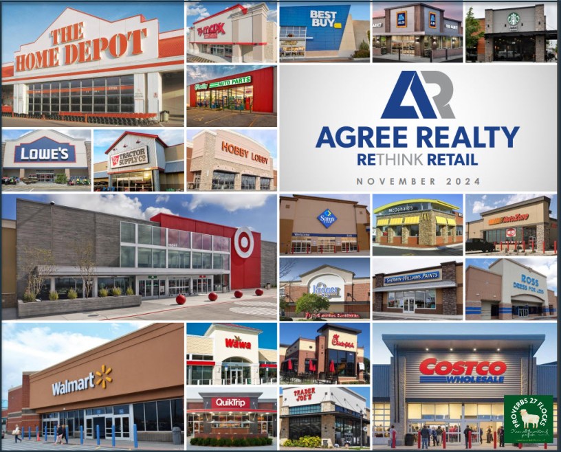 Agree Realty Corporation (the “Company”), a Maryland corporation, is a fully integrated real estate investment trust (“REIT”) primarily focused on the ownership, acquisition, development and management of retail properties net leased to industry leading tenants. The Company was founded in 1971 by its current Executive Chairman, Richard Agree, and its common stock was listed on the New York Stock Exchange in 1994. As of March 31, 2024, the Company owned 2,161 properties, with a total gross leasable area (“GLA”) of approximately 44.9 million square feet.