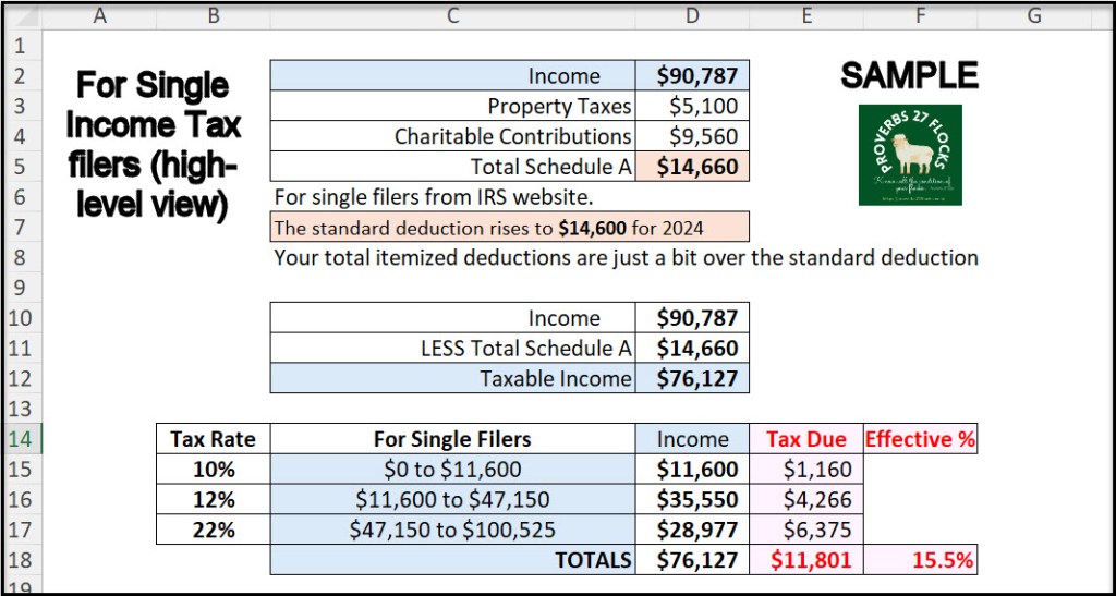 How did I come up with these numbers? Thanks to a friend’s request. I was asked to do some high-level tax calculations for a friend. She sent me her total income, her Schedule A deductions, and asked what she would owe for her Federal income taxes. I took the spreadsheet I created to do the calculations and created one for Cindie and me. This helped me see the big picture in a single spreadsheet.