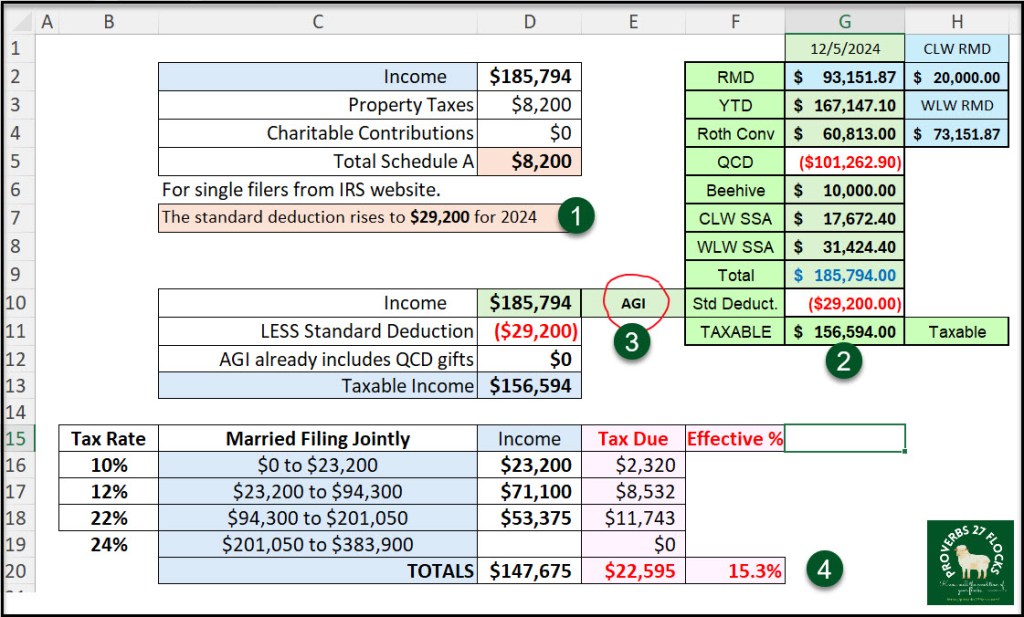 Because of the QCD, which is calculated before the AGI on the income tax form, our current AGI is $185,794. This significantly reduces our income taxes for 2024. Then, there is the standard deduction of $29,200, reducing our taxable income to $156,594. If we have any capital losses, which will be small, this number will drop a bit.